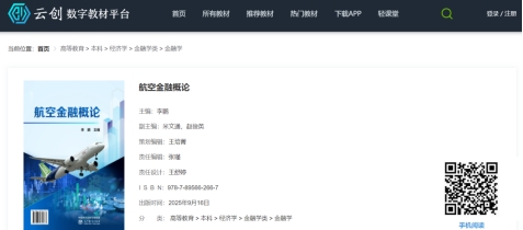 2026年3月25日,经济学院《航空金融概论》数字教材正式由高等教育出版社出版,在云创数字教材平台面向国内外公开发行。该教材由经济学院李鹏教授担任主编,米文通副教授和赵俊英副教授担任副主编,历时一年半编纂完成,为国内航空金融领域首本数字化出版的教材。