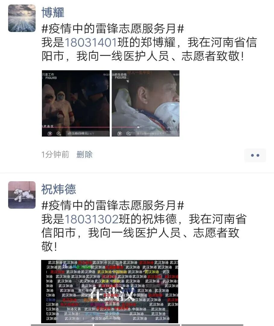 这次活动中青年志愿团组织举办了#疫情中的雷锋志愿服务月#视频打卡活动。组织同学们观看有关此次疫情的纪录片,并在社交媒体进行打卡,希望通过这种方式让大家去了解和感悟那些逆行者们在疫情面前大无畏的牺牲与奉献精神,向疫情中奋斗的无名英雄们致敬。