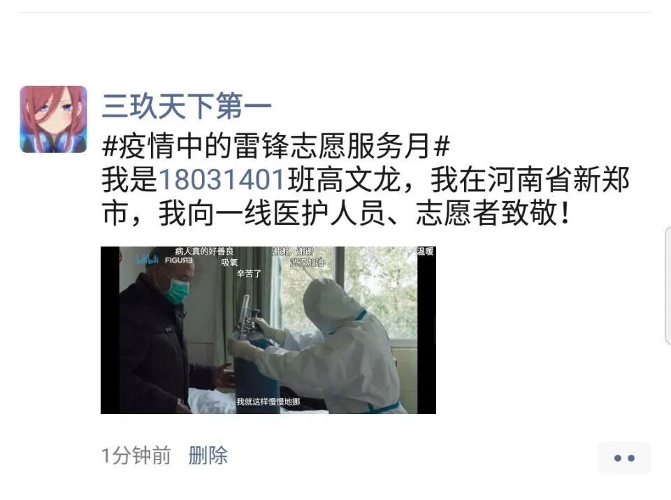 2020年因为疫情我们的学习生活都受到了很大的影响,雷锋月也因为疫情的爆发而变得与以往不同。在疫情面前作为雷锋精神的传承者,我们应当不逃避不退缩,在与病毒作斗争的过程中奉献自己的力量,做自己能做的事,发出属于自己的那一片光。
