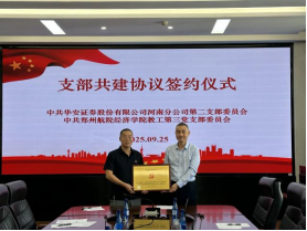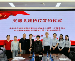 贺琼书记首先致欢迎词,对经济学院在学科建设、科研成果、党建成果、航空特色和人才培养等方面进行了介绍。许鲁南总经理就华安证券及河南分公司业务发展情况、党建成果进行介绍。双方就今后课程共建、党建共建、校企资源对接共享、毕业生实习就业等进行广泛交流,达成初步合作意向。学院教工第三党支部与华安证券河南分公司第二党支部签订支部共建协议。
