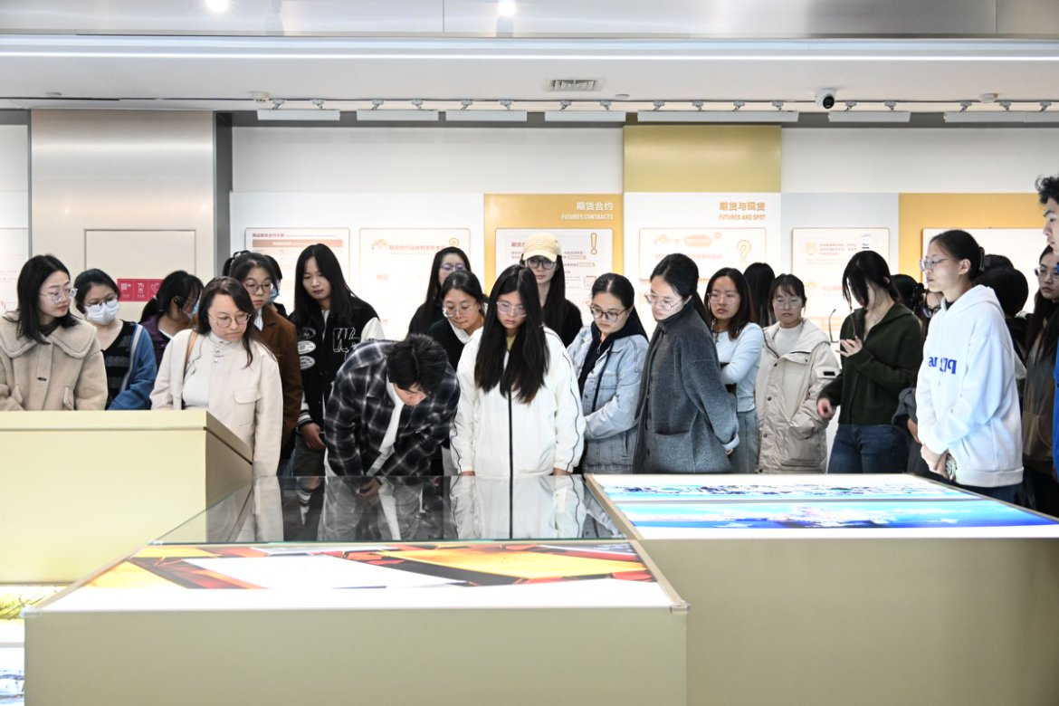 在专业讲解员的引导下,师生们依次参观了博览馆的多个展区,系统了解了中国期货市场的交易机制及监管体系。讲解员结合典型案例,生动介绍了期货与衍生品在风险管理、价格发现和资源配置等方面的重要功能,使同学们对期货市场在现代化经济体系中的作用有了更加直观的认识。
