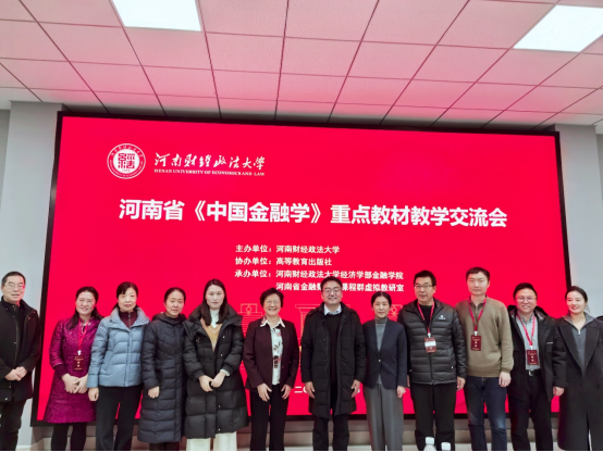 20251214日,河南省《中国金融学》重点教材教学交流会在河南财经政法大学郑东校区成功举办。本次会议由河南财经政法大学主办,高等教育出版社协办,河南财经政法大学经济学部金融学院及河南省金融数字化课程群虚拟教研室承办。我院金融学专业负责人李鹏教授、金融科技教研室主任许鼎博士、金融学教研室主任汪淑娟博士以及金融学科骨干教师陈梦筱教授、盛昌琴老师、张靖霞老师、黄国轩老师、米文通老师受邀参加。