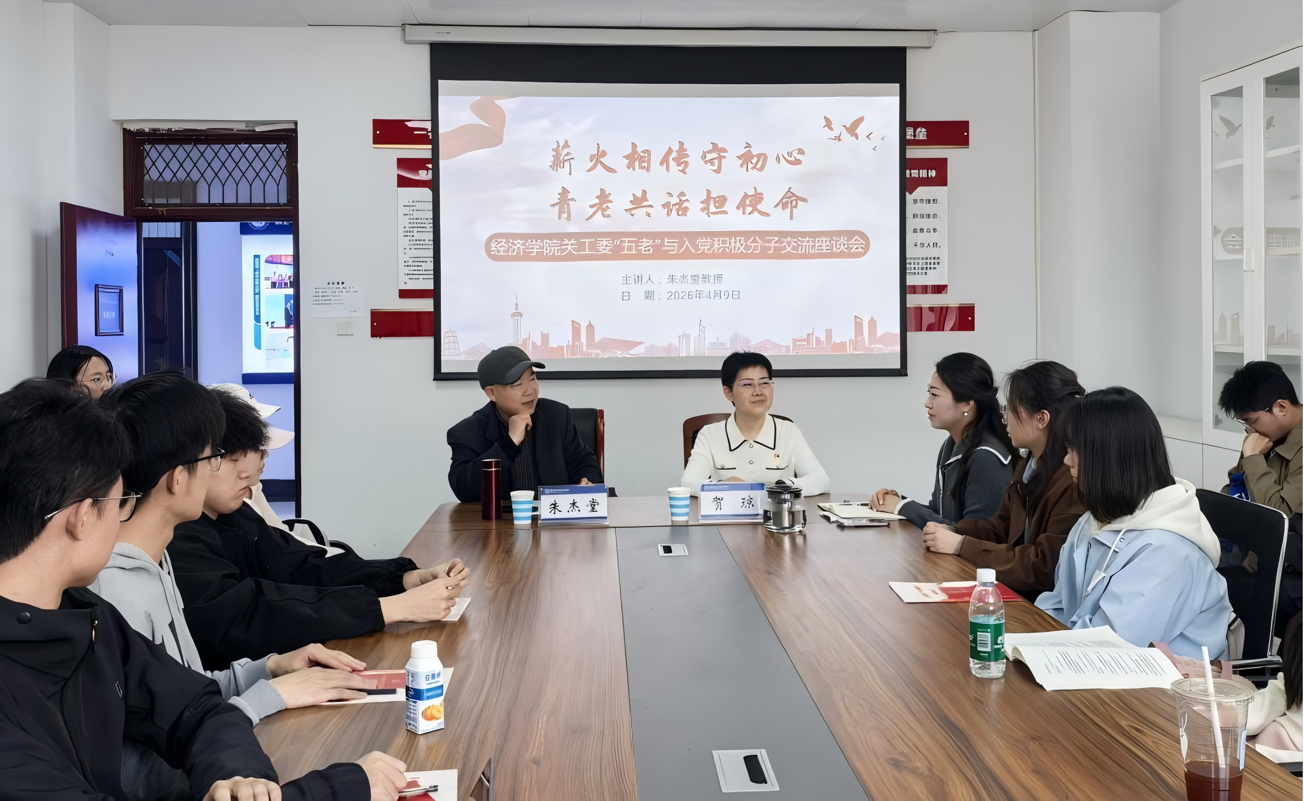 为深入学习贯彻习近平新时代中国特色社会主义思想,筑牢青年理想信念根基,4月9日下午,经济学院于05A403开展“薪火相传守初心,青老共话担使命”交流座谈会。经济学院关工委邀请退休党员教师、优秀教育工作者朱杰堂担任主讲嘉宾,经济学院党委书记贺琼、学生党支部书记宋昊哲、第76期入党积极分子参加。座谈会由党委书记贺琼主持。