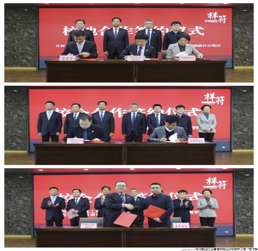 签约仪式上,郑州航空工业管理学院与开封市祥符区人民政府、开封市产城融合示范区管委会签署校地合作框架协议。根据协议,三方将在共同组建科技智库团队、联合培养高素质专业化人才、共建产学研基地、促进科技成果转化等方面开展广泛合作。同时,郑州航空工业管理学院分别与清祥人工智能研究院签署研究生联合培养协议、本科生实习基地协议,与晋开集团、青天伟业仪器仪表有限公司签订就业基地协议。这次合作是校地双方面向未来、共谋发展的战略选择,有利于推进创新平台共建、推动科技成果转化、促进产教融合发展。(文图/经济学院 审校/贺琼)